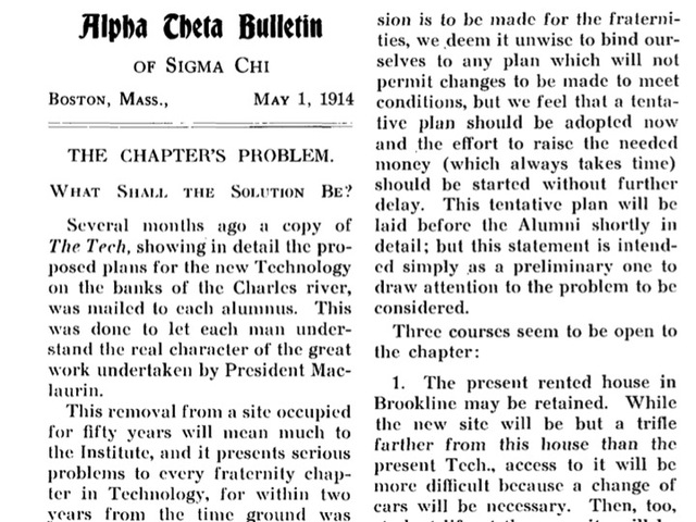 As we celebrate 130 years of the chapter, we should note that we have another anniversary coming up in a couple of years. 2014 will mark the 90th anniversary of our ownership of 532 Beacon St. Before 532 Beacon St, the chapter rented a house further down Beacon Street in Brookline. This was a convenient enough location to reach the Boylston Street campus of MIT, but as the Institute began building its new campus on the other side of the river, MIT's fraternities fretted about what to do. Alpha Theta needed a new location.